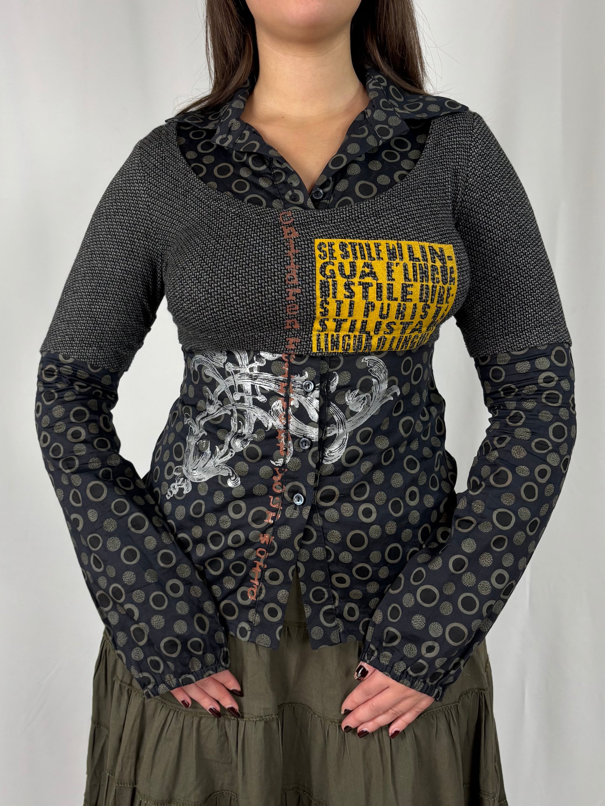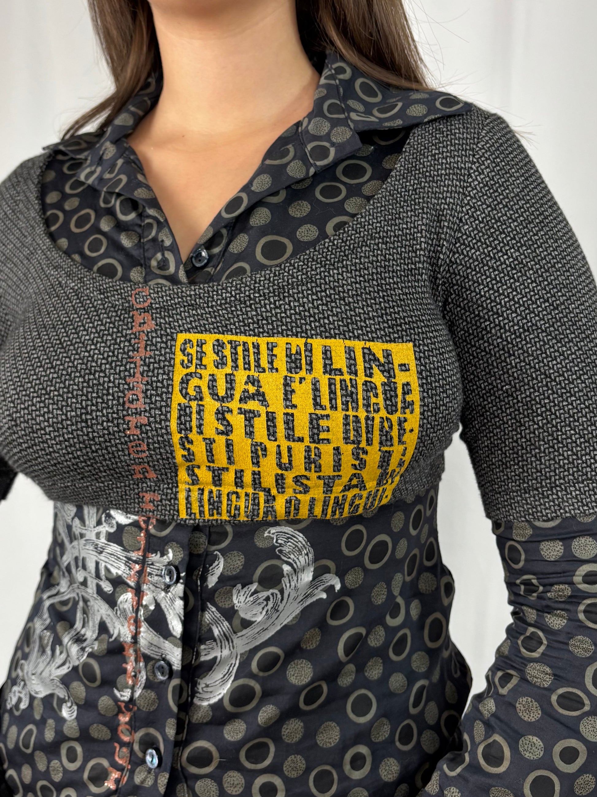 Chemisier aux motifs bulles qui joue la superposition grâce à son système de layering intégré. Le teeshirt stretch crop top intégré aux manches courtes est floqué d'une calligraphie jaune éclatante sur la poitrine, tandis que le bas du chemisier brille d'un imprimé argenté. Une inscription jaune orne l'arrière du col pour une touche secrète. La coupe cintrée avec fronces latérales affine la silhouette, complétée par une fermeture éclair discrète sur le côté. Un basique réinventé pour les filles qui aiment les détails surprenants et les looks en couches.