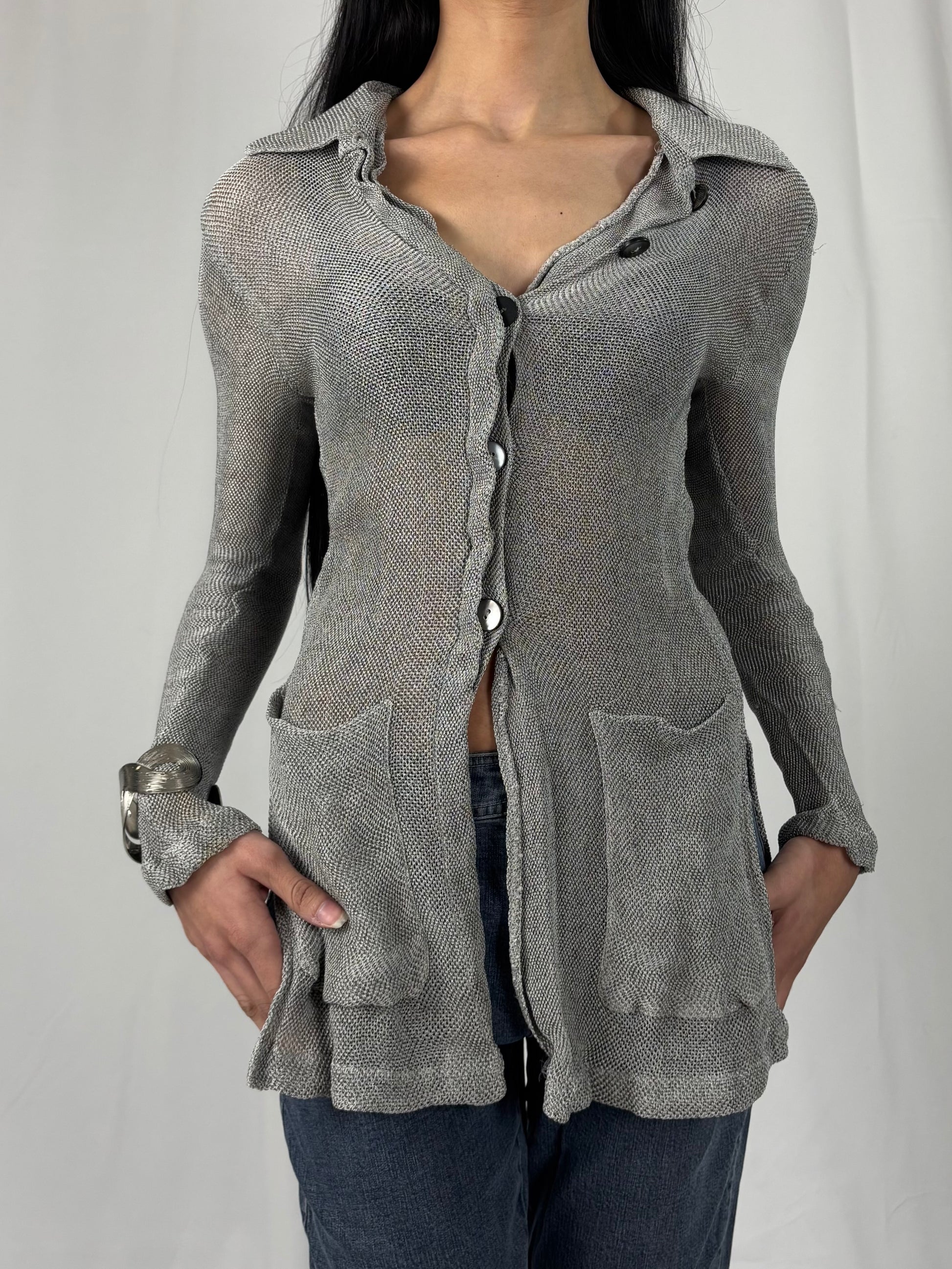 Gilet tricot aéré en maille ressille argentée. Col chemise structuré pour une allure sophistiquée et deux grandes poches pratiques au devant. Ouverture boutonnée à partir du nombril et généreuses fentes latérales qui offrent une belle liberté de mouvement.